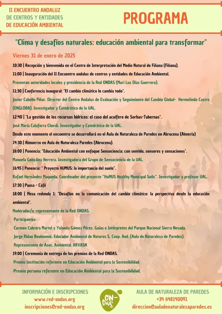 Abrucena y Fiñana acogen el viernes 31 de enero y el sábado, 1 de febrero, el II Encuentro Andaluz de Centros de Educación Ambiental con el lema 'Clima y desafíos naturales: educación ambiental para transformar'. Organizado por el Aula de Naturaleza Paredes y la red Ondas de Centros de Educación Ambiental, la actividad contará con varias conferencias sobre el clima o la gestión de los recursos hídricos, destacando la importante labor de educación ambiental para luchar contra el cambio climático. En el Encuentro se entregarán los premios de la Red Ondas y se conocerá el proyecto educativo del Aula de Naturaleza Paredes.