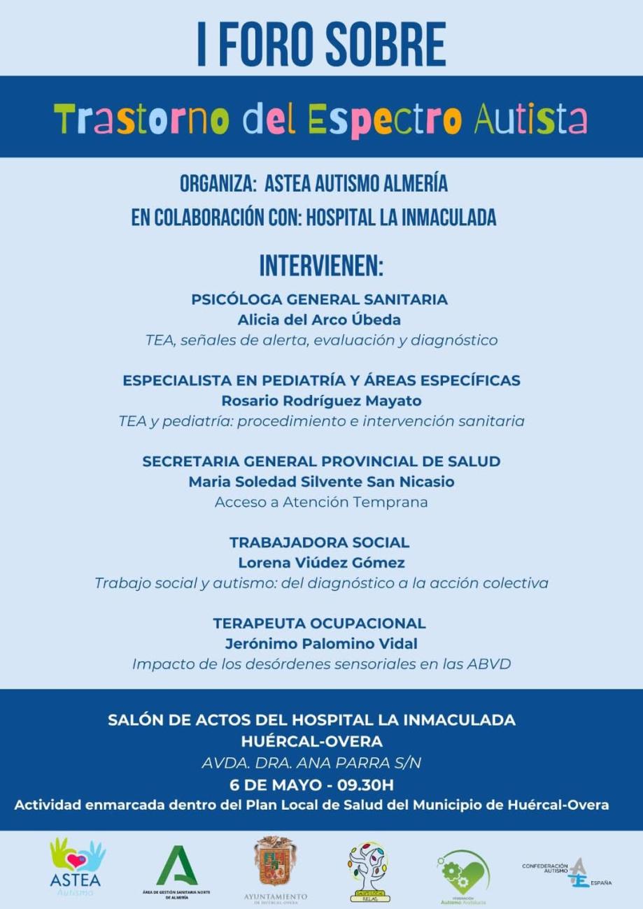 El I Foro sobre TEA está organizado por ASTEA Autismo en colaboración con el Hospital la Inmaculada de Huércal Overa. La presidenta de ASTEA, Mónica López, ha explicado que en este primer Foro que nace con vocación de continuidad se contará con profesionales de distintos ámbitos que profundizarán entre otros temas en las primeras señales de alerta y diagnóstico de autismo, en la Atención Temprana, el Plan de Intervención especializado, los recursos destinados a las familias afectadas y las herramientas en terapia ocupacional.