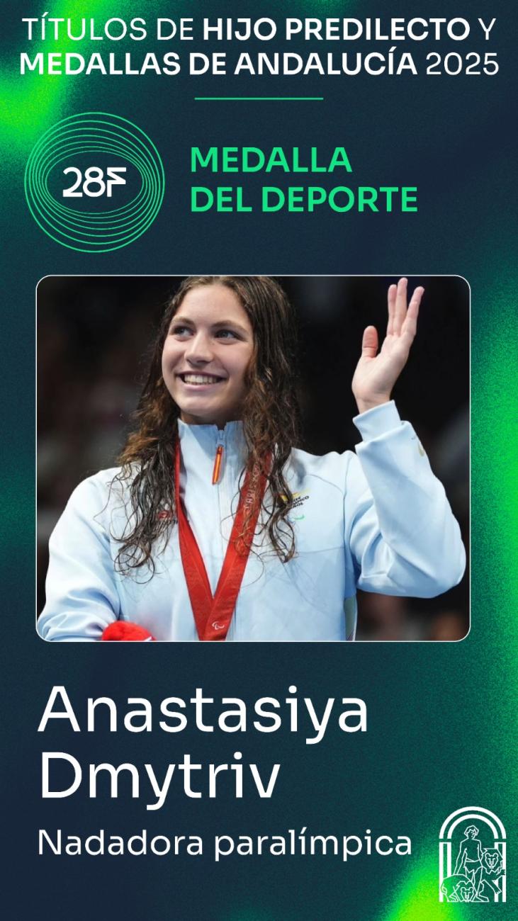 La Ucraniana afincada en la Puebla de Vícar y con nacionalidad española, Anastasiya Dmytriv recibirá el 28F en el Teatro de la Maestranza de Sevilla la medalla de Andalucía del Deporte por sus grandes gestas en los paralímpicos de París 2024.