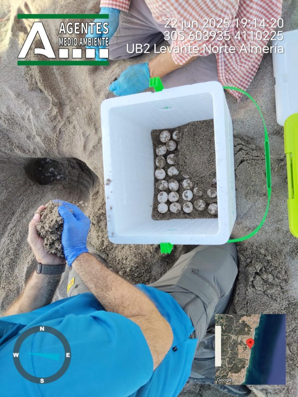 Nuevo anidamiento de tortuga boba en una playa de Mojácar. Los 99 huevos encontrados han sido trasladados para un desarrollo seguro de los mismos