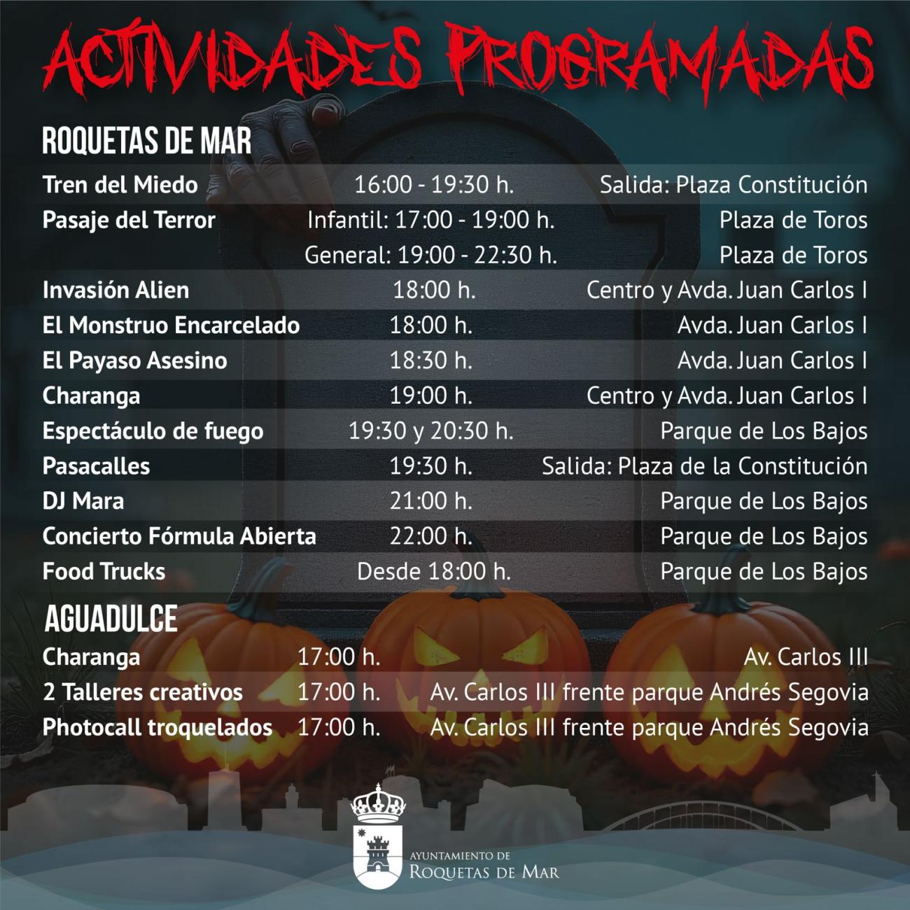 Entre las actividades programadas destaca el Tren del Miedo con salida de salida desde Plaza de la Constitución, el Pasaje del Terror que se llevará a cabo en la Plaza de Toros con pase infantil y general a partir de los 13 años, Invasión Alien por las calles del centro y la Avenida Juan Carlos I, El Monstruo Encarcelado, El Payaso Asesino, Charanga a partir de las siete de la tarde, un Espectáculo de Fuego “Gota del Mar” en el Parque de Los Bajos, Pasacalles Coreográfico con salida desde la Plaza de la Constitución, Dj Mara, Concierto de Fórmula Abierta a partir de las diez de la noche en el Parque de Los Bajos y Food Trucks en este mismo espacio.