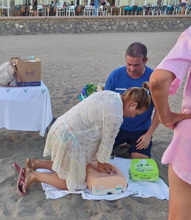 Uno de esos profesionales es Juan Carlos González, enfermero de Urgencias, que nos ha explicado que, tras colocar una carpa de cada una de las playas en las que se desarrolla 'Verano Saludable' se ofrece a los usuarios de la playa explicaciones sobre qué hacer ante la picadura de una medusa, o ante un golpe de calor. También cómo elaborar un botiquín o cómo llevar a cabo la Reanimación Cardiopulmonar (RCP) y la obstrucción de las vías aéreas. Son las temáticas de los talleres que ya han comenzado a desarrollar en la playa de El Palmeral de Almería Capital, Retamar, La Fabriquilla de Cabo de Gata y Carboneras.